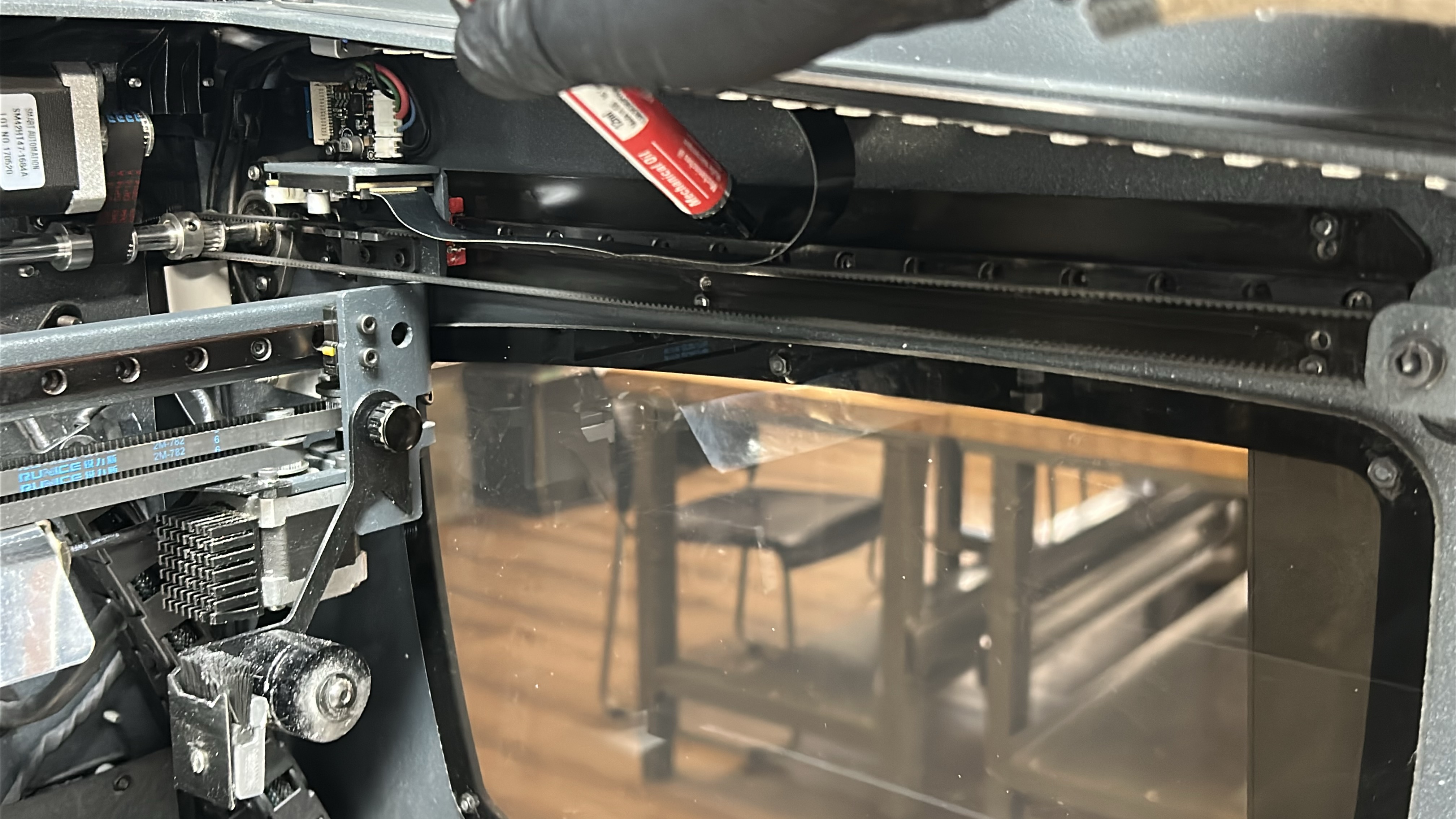 11. Apply the lubricating oil along the Z shaft sidebars ensuring no drips. Clean the Z-axis spindle with an absorbent paper towel or cloth targeting any visible sullied grease. Turn the spindle manually to access the rear.