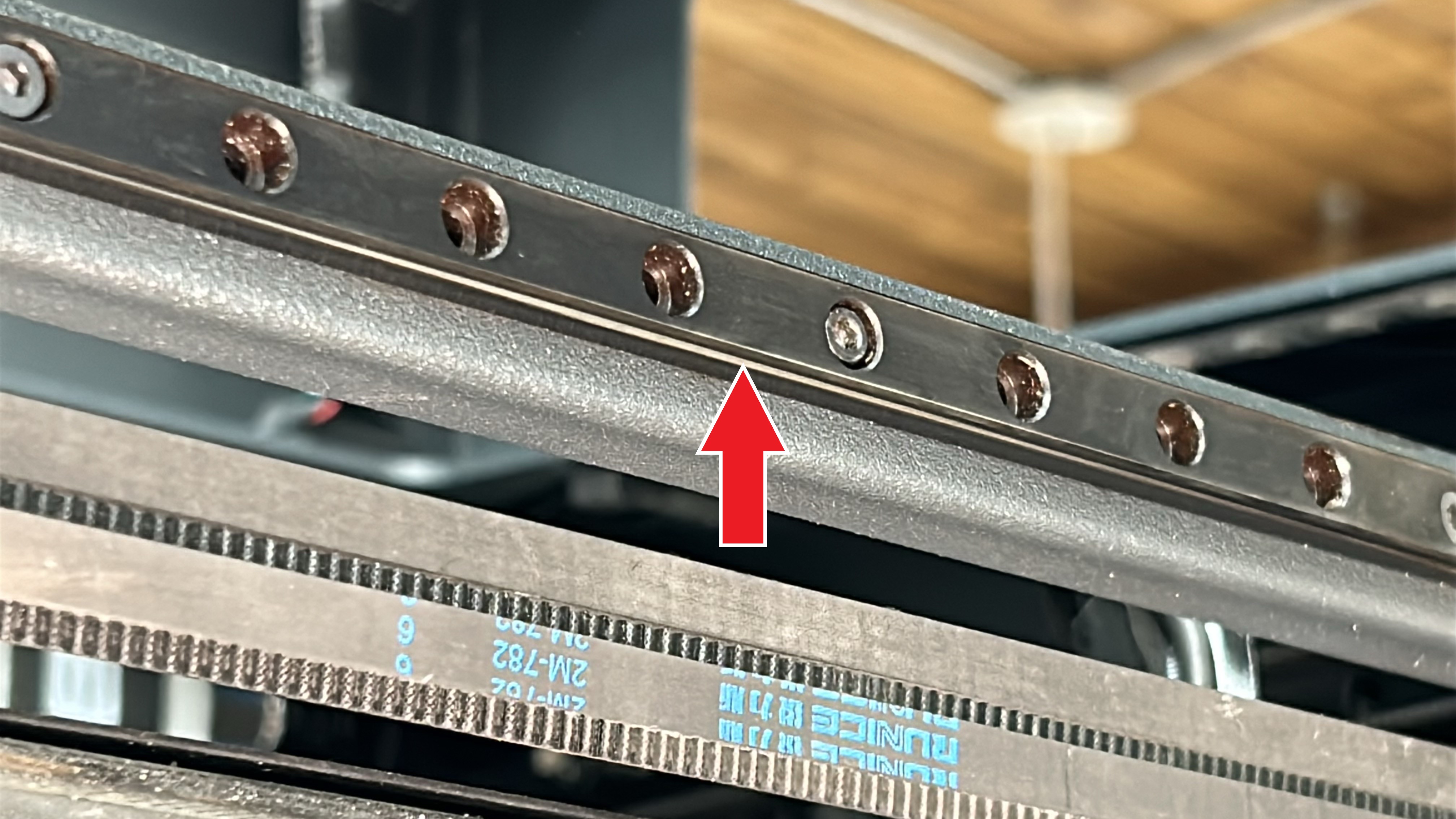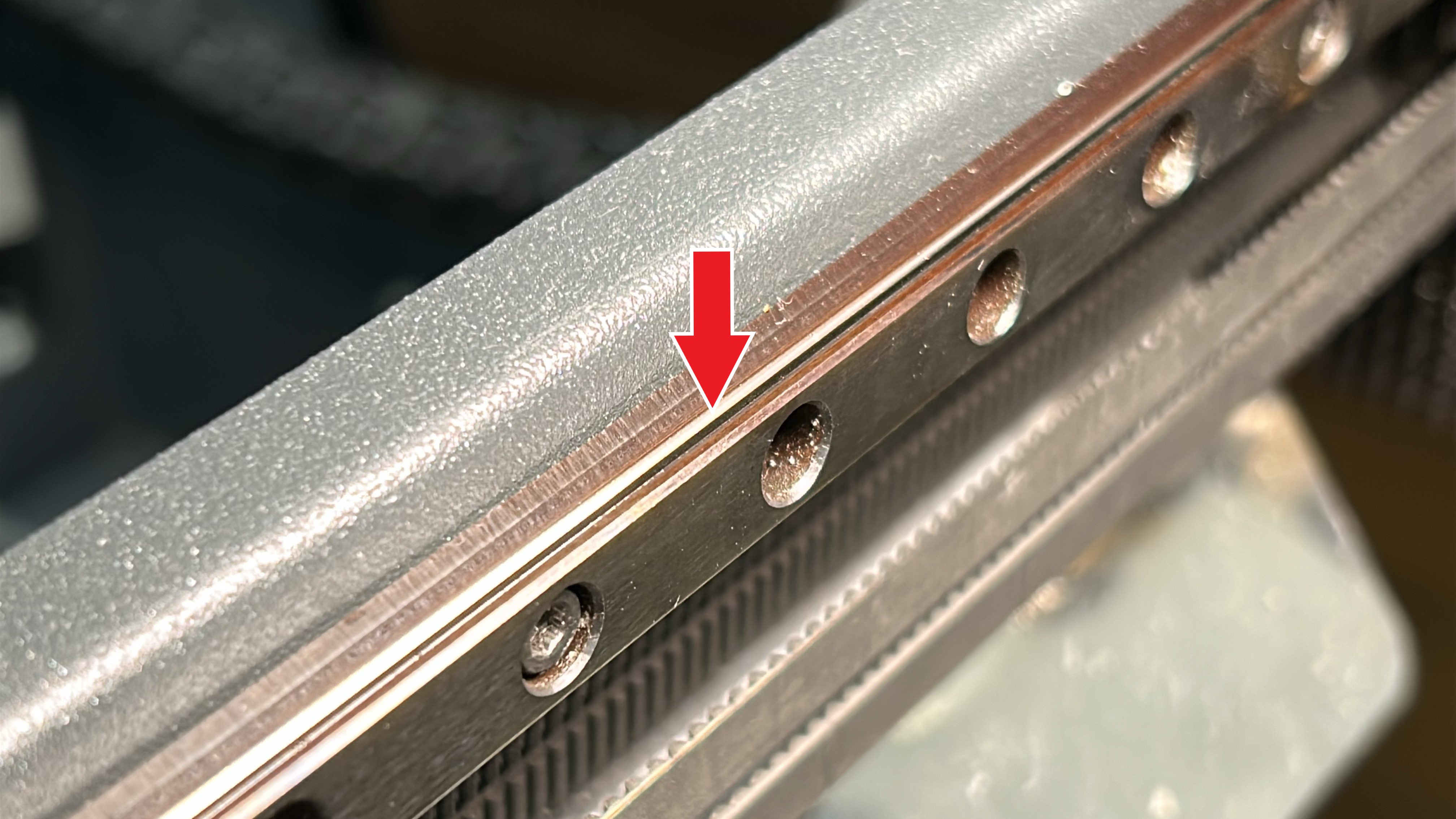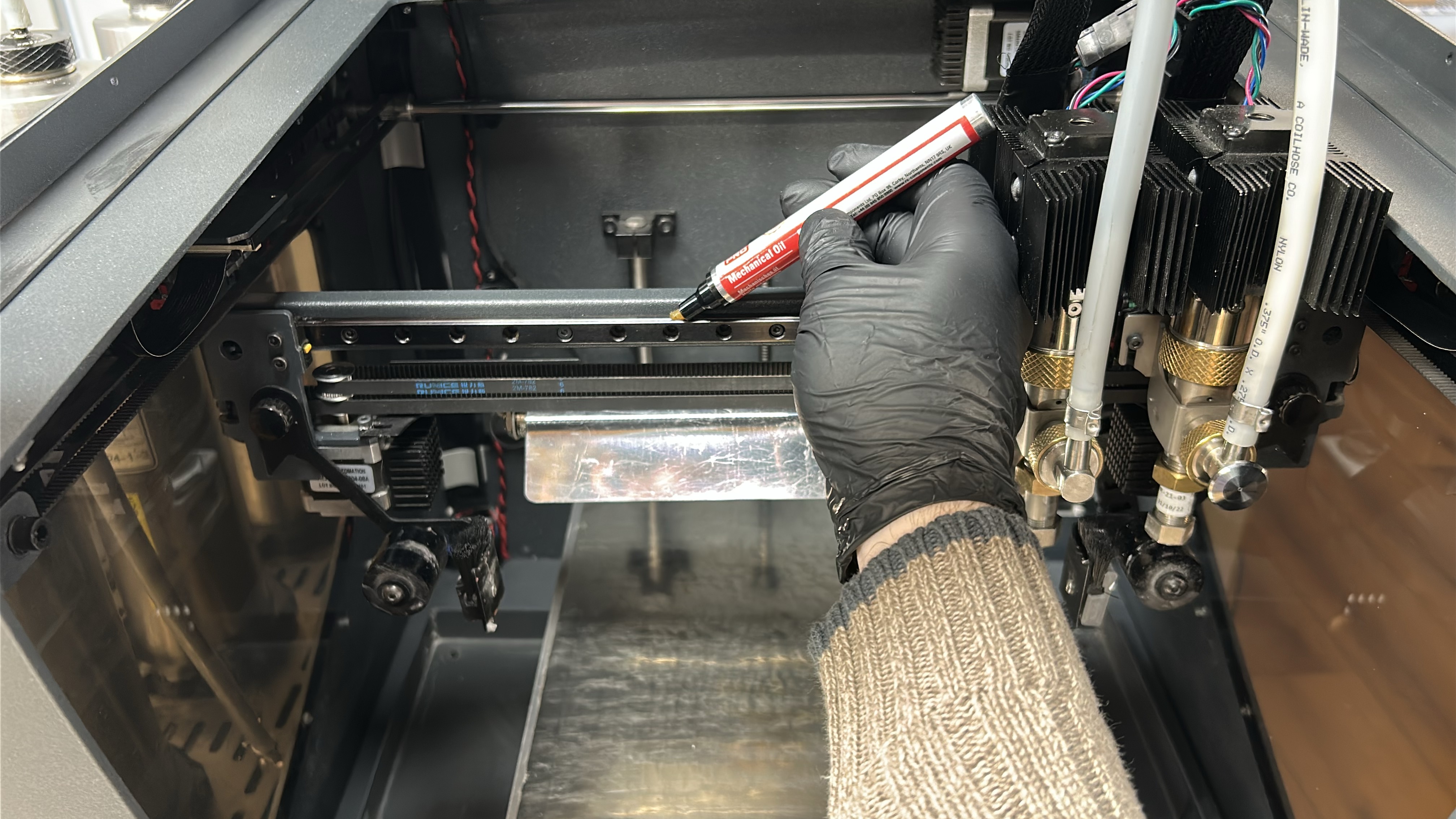 4. Use the machine oil to apply a thin coat of lubricant to the X-axis linear guide, applying with emphasis on the superior and inferior faces of the linear guides as imaged below. Move the printheads to the opposing side of the linear guide and repeat this process.
