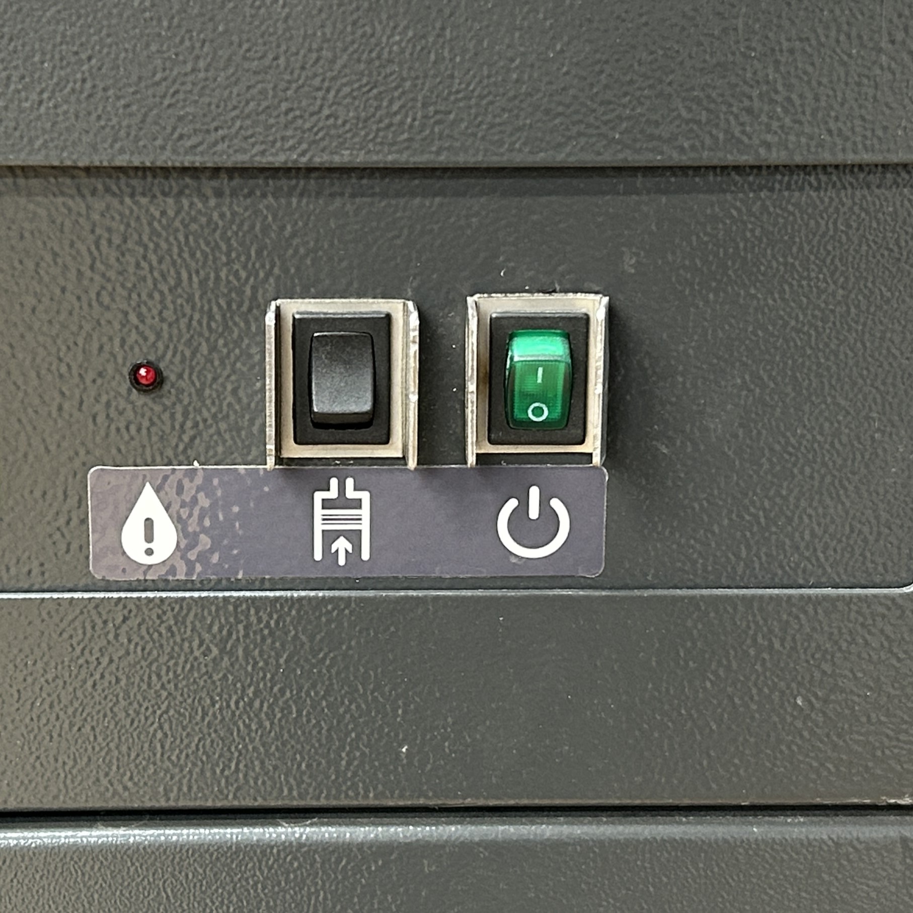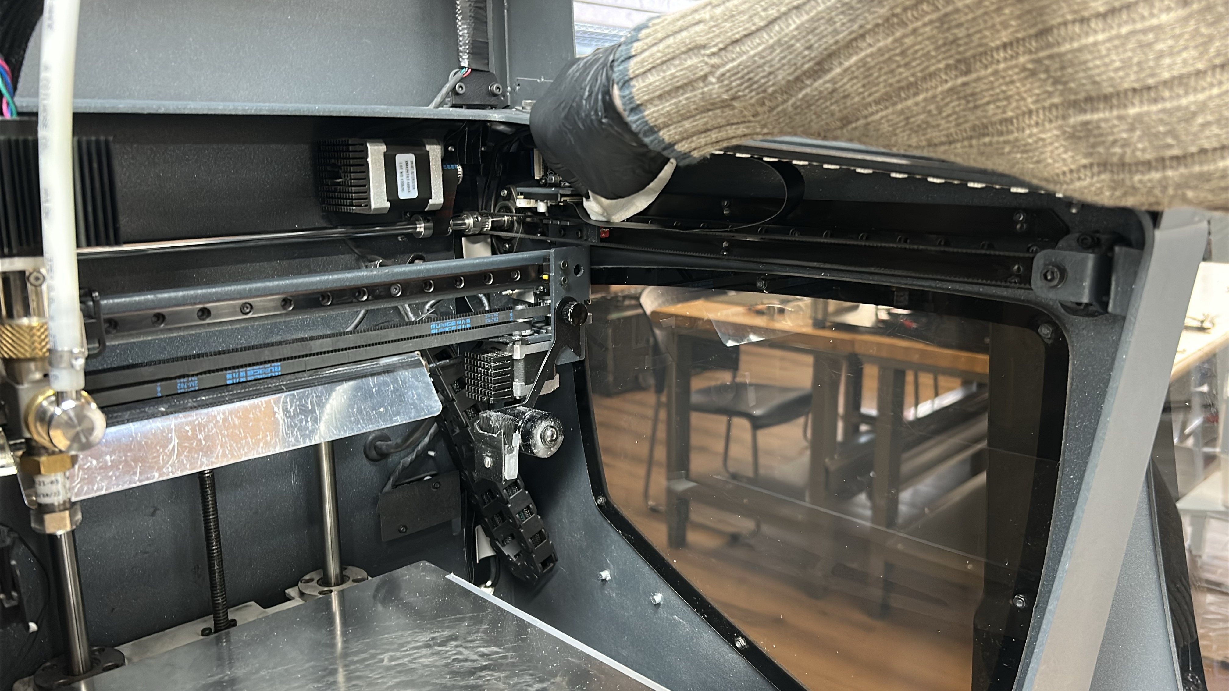 1. Turn off the printer via the switch on the lower cabinet. During this process it is advised to move the axes manually in order to reach all parts of the linear guides.