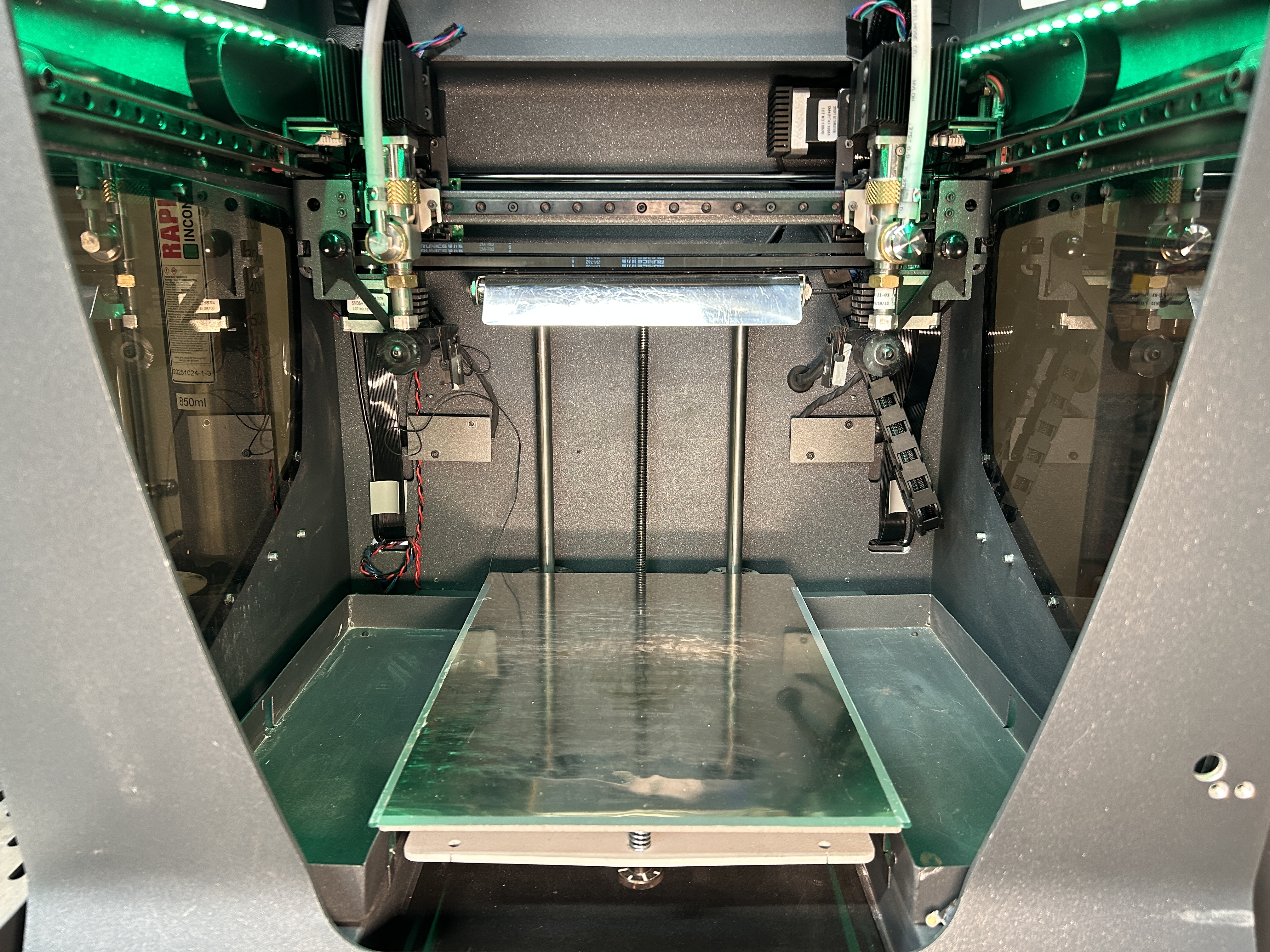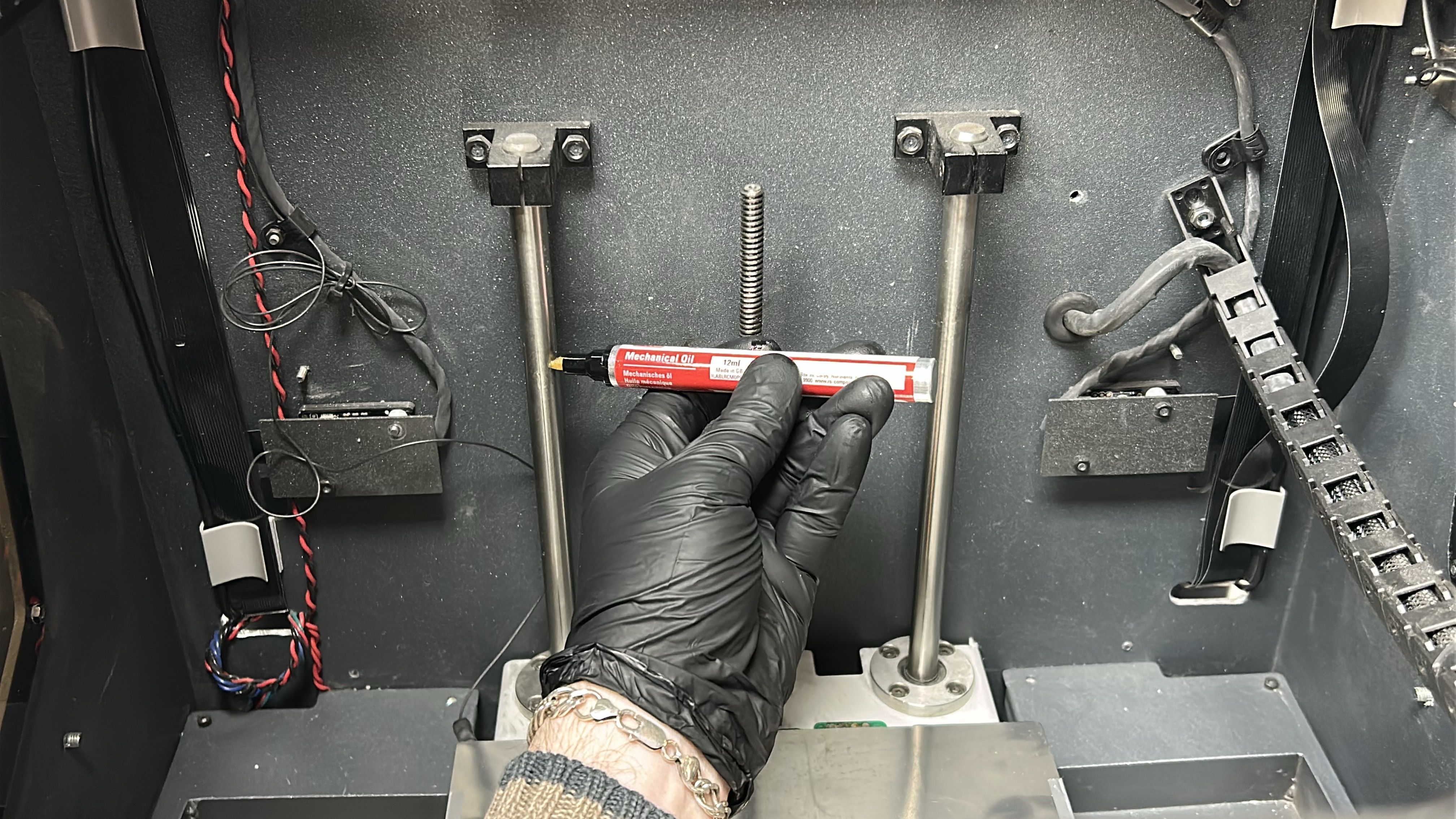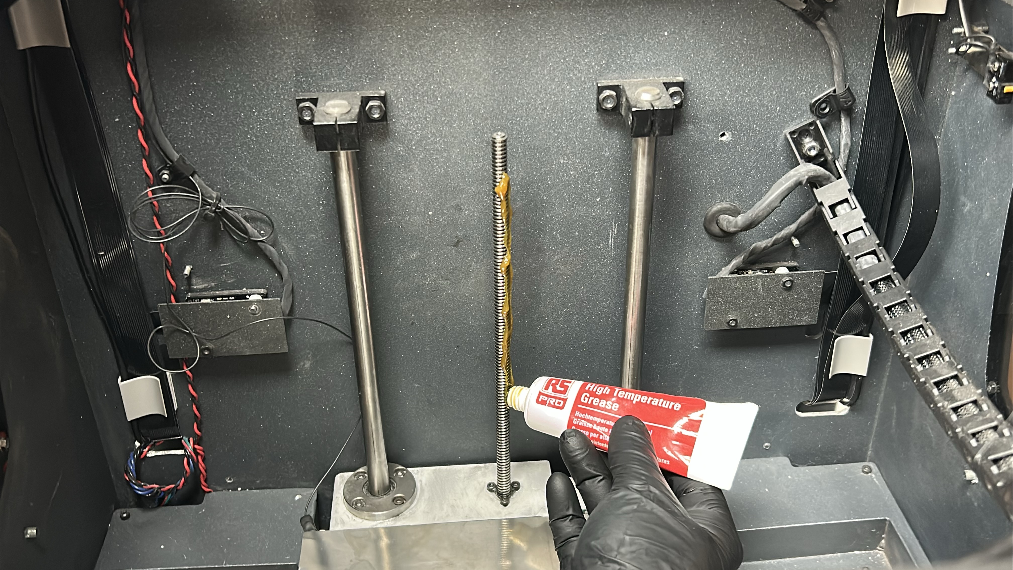 It is recommended to periodically clean and lubricate the axes of the Rapidia Conflux 1 3D printer with the included grease and oil from the spares kit to provide smooth and precise performance of the mechanical components.