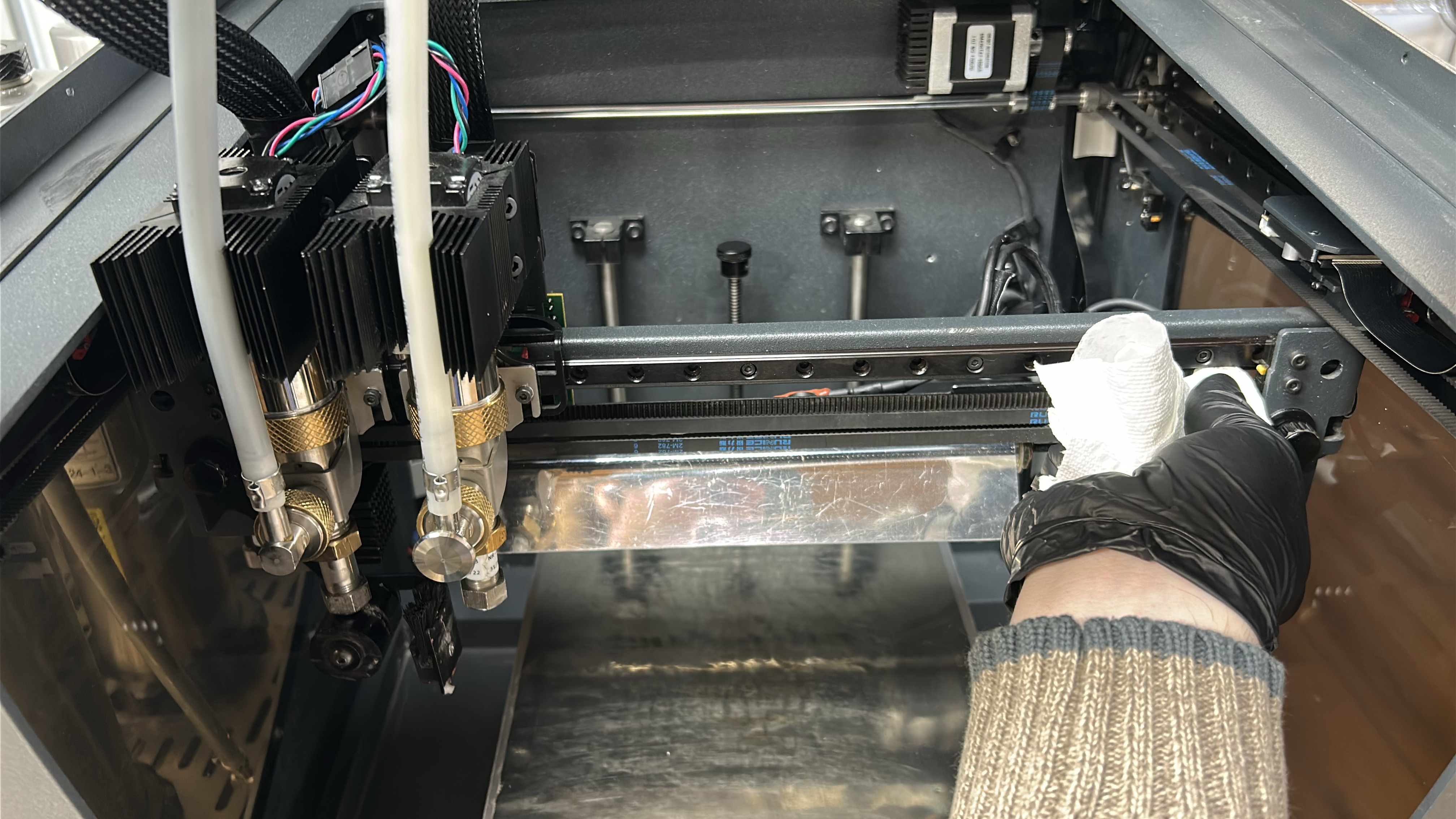 3. With a paper towel or cloth moistened with a solvent (isopropanol) wipe the X-axis linear guide, starting from the middle and moving outwards. Move the printheads to the opposite side and repeat the process on the other end of the linear guide.