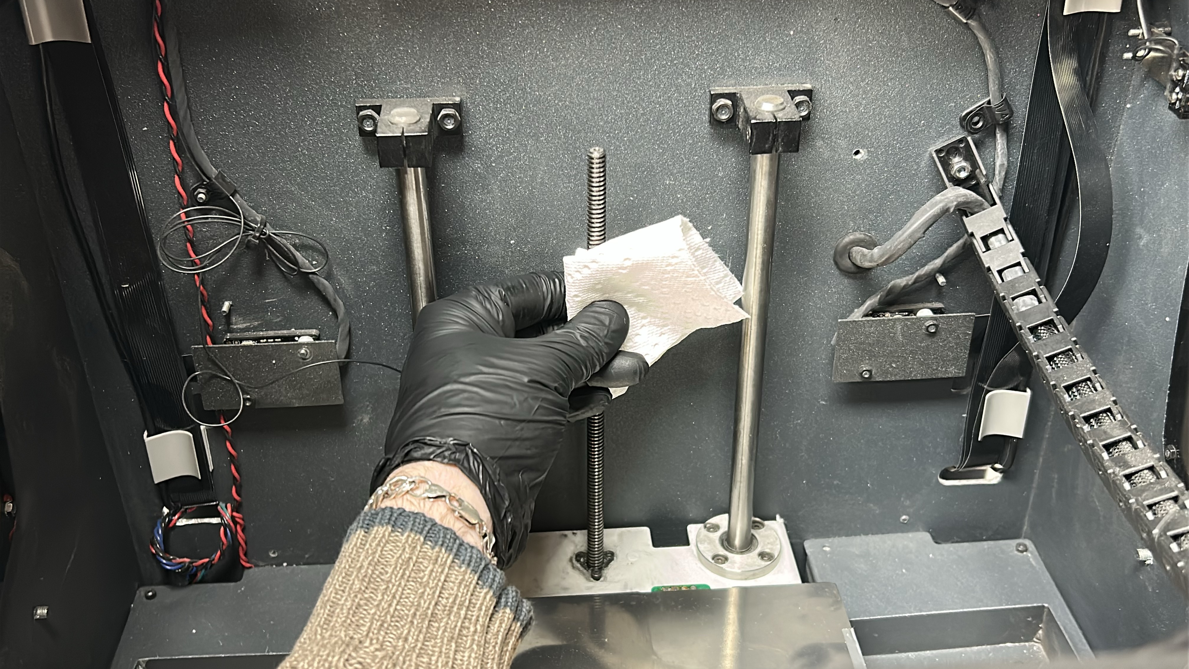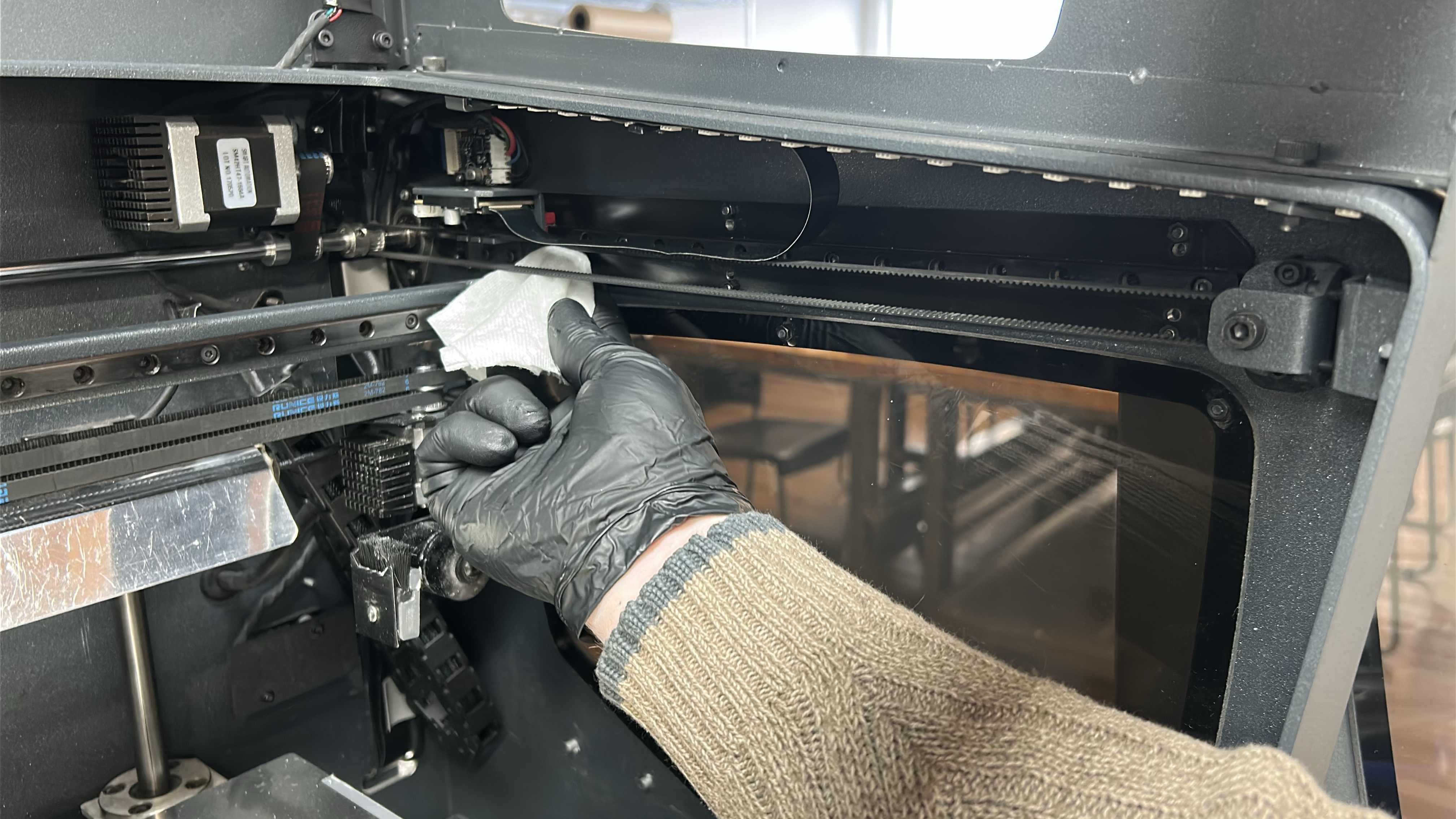 5. Start by moving the printing gantry to its parked position and powering off the printer, move the printheads to one side so that one of the Y-axis linear guides is easily accessible. Using an absorbent paper towel or cloth wipe the linear guide on the superior and inferior faces to remove any dirt or dust.
