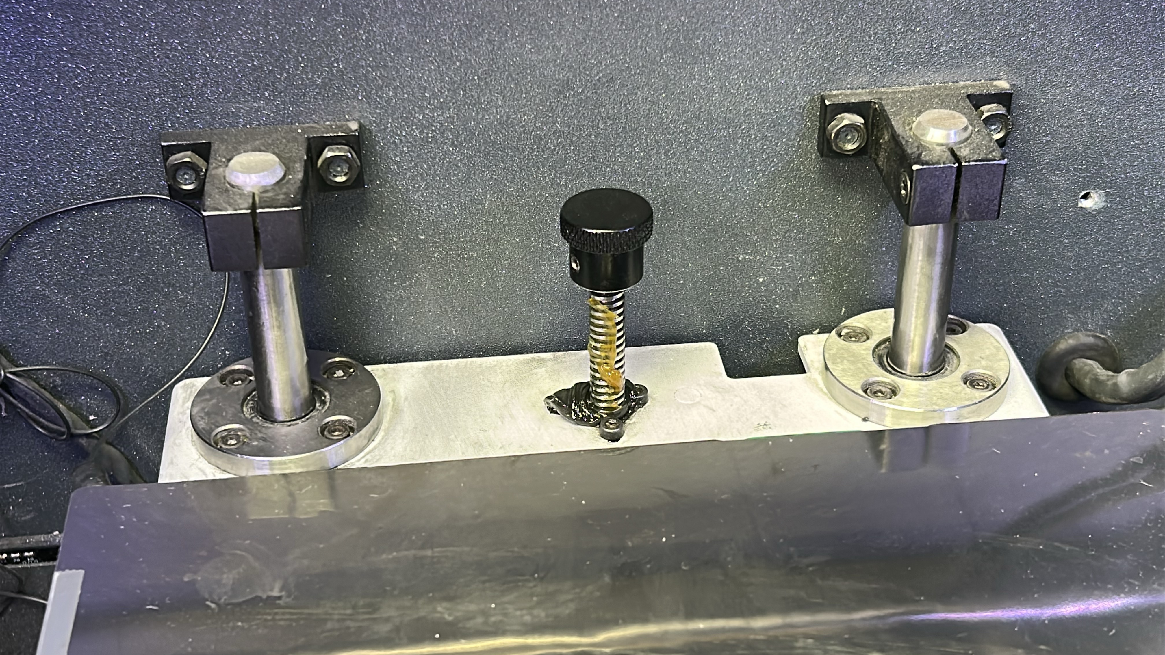 11. Apply the lubricating oil along the Z shaft sidebars ensuring no drips. Clean the Z-axis spindle with an absorbent paper towel or cloth targeting any visible sullied grease. Turn the spindle manually to access the rear.