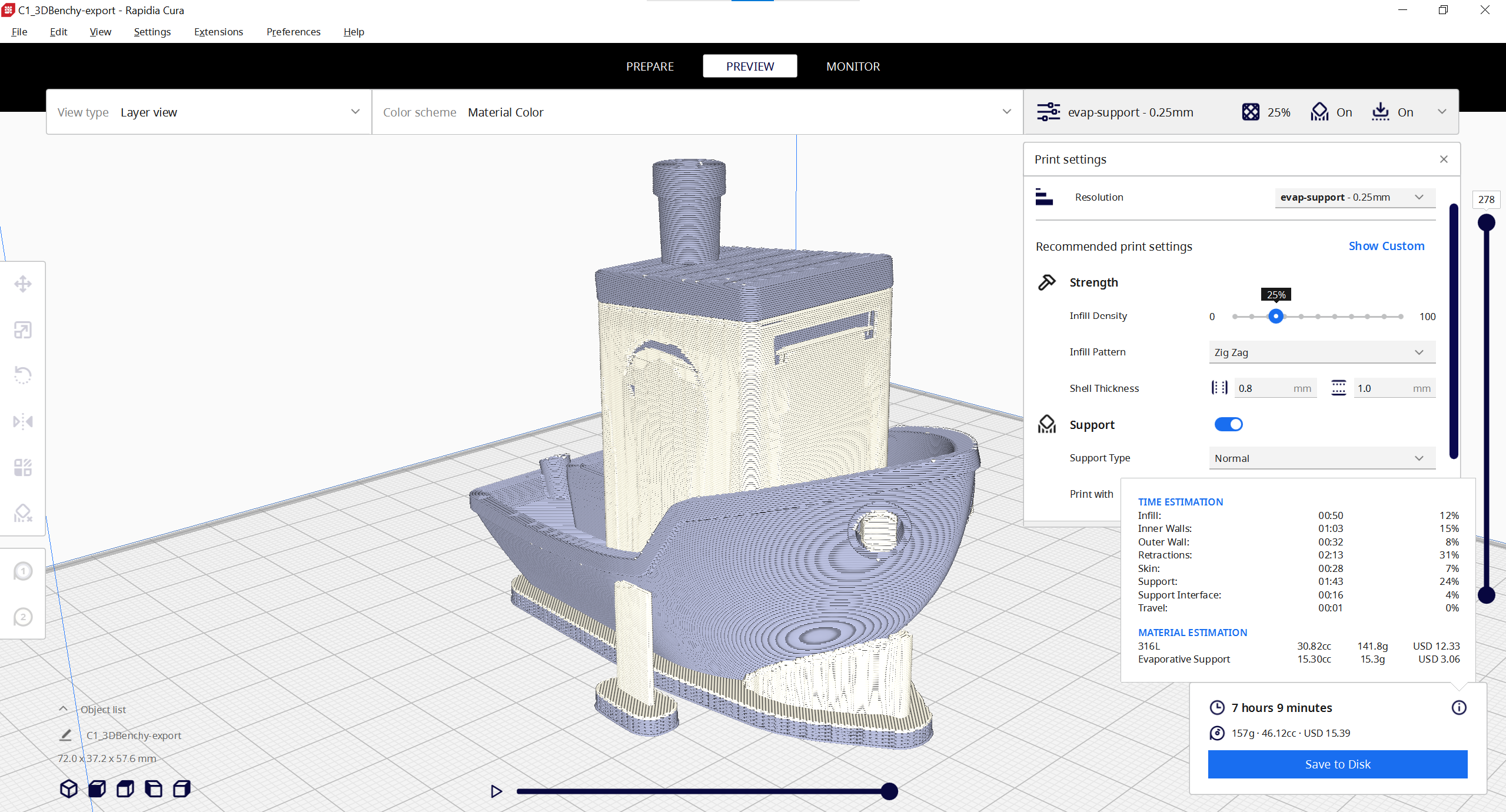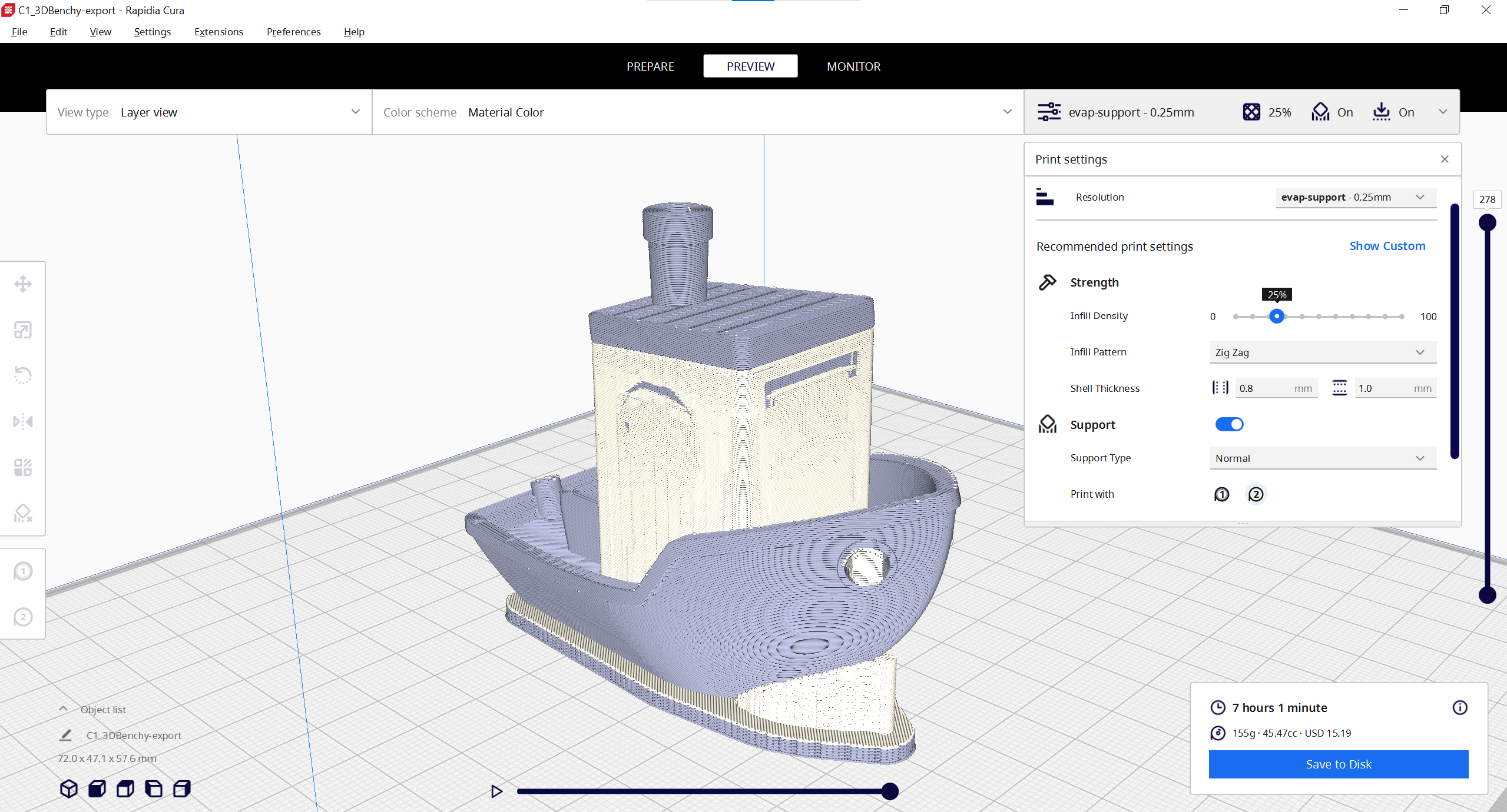 Slicing the 3DBenchy with the default settings will look like this: