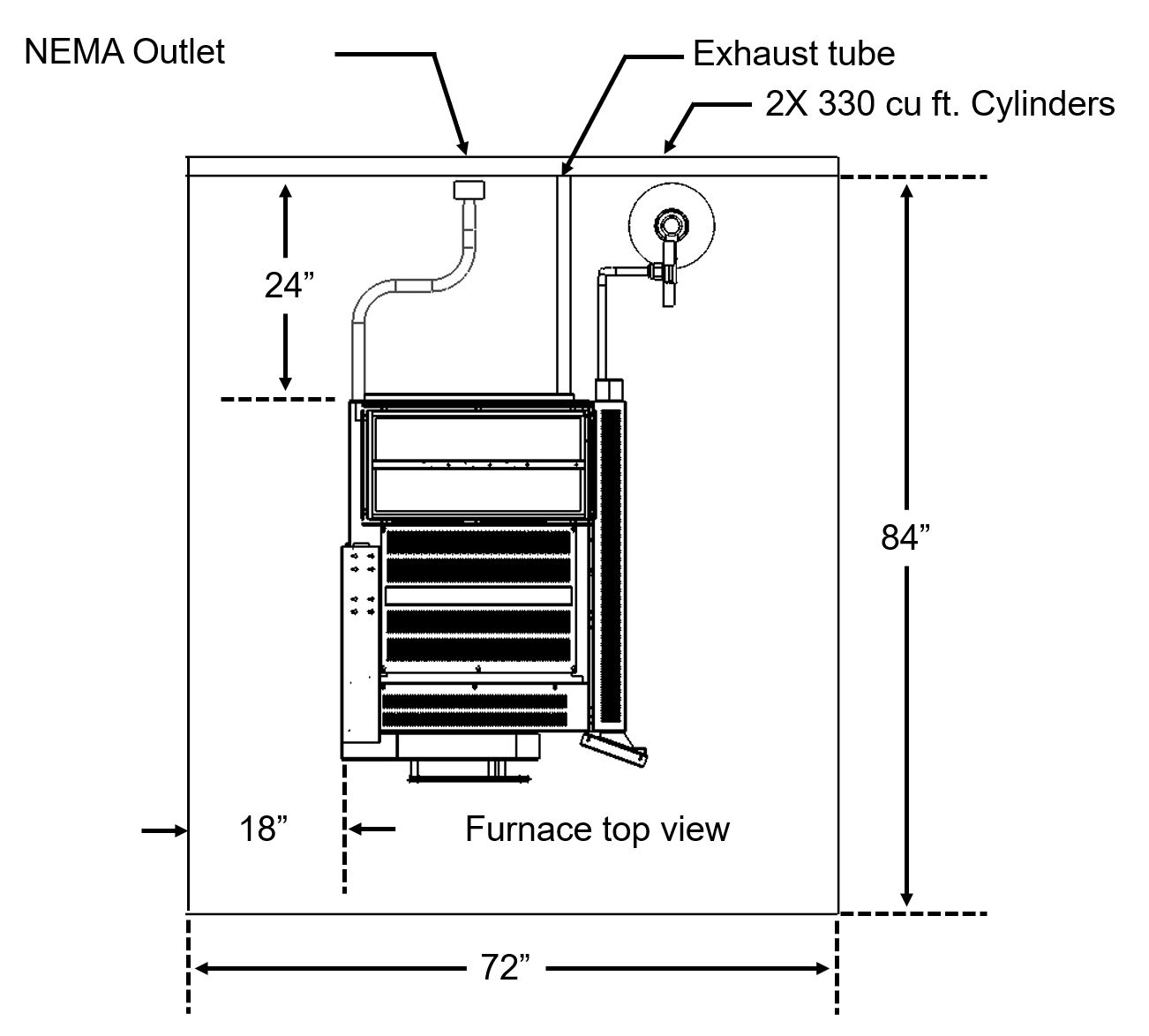 Installation and operating space of 6' wide x 7' deep x 8' high for the furnace (see layout below).