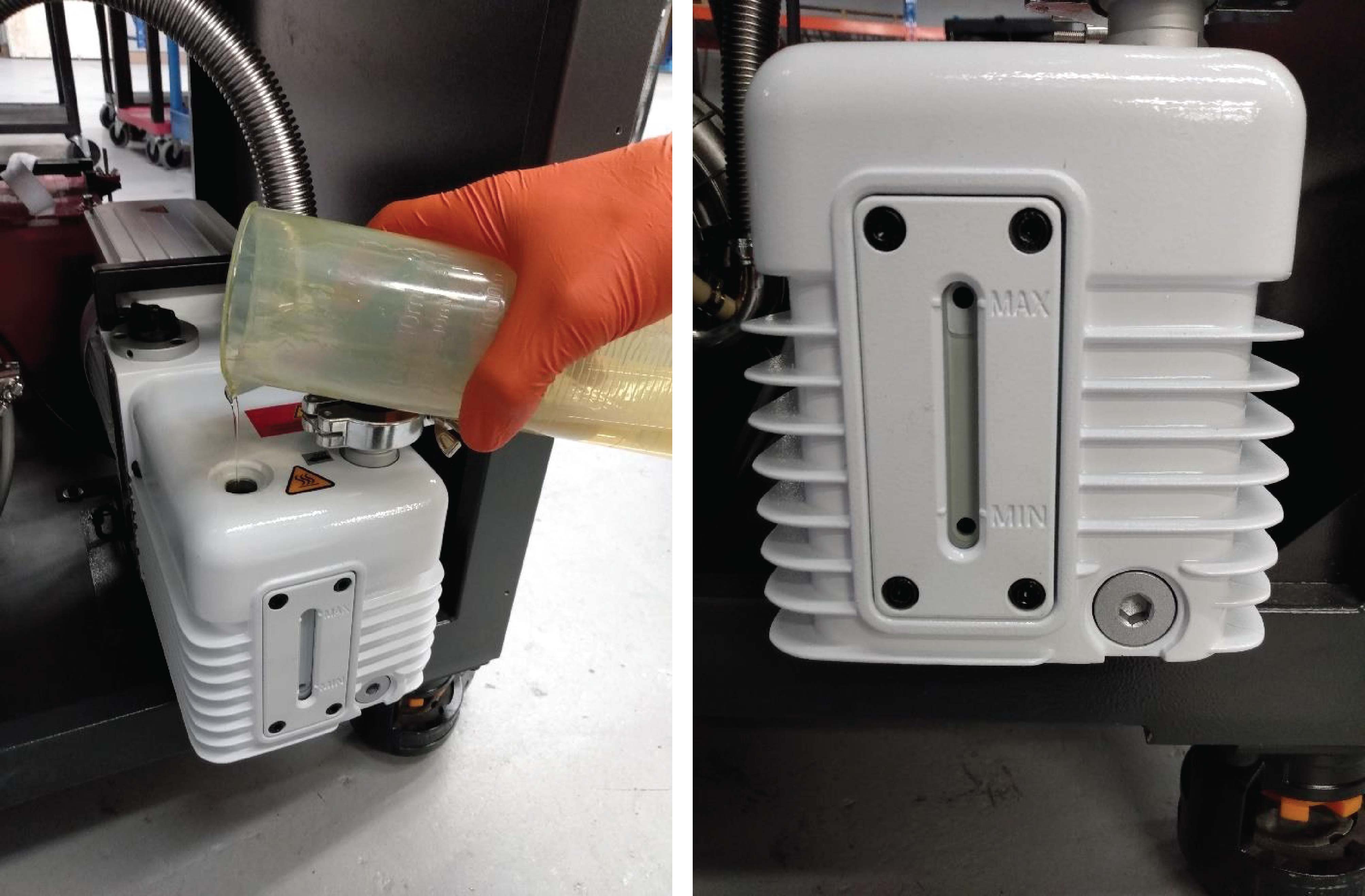 1. Before performing an oil change, run the vacuum pump for about 30 minutes to allow it to warm up fully. If the pump is cold, it can be turned on through the Status Panel.